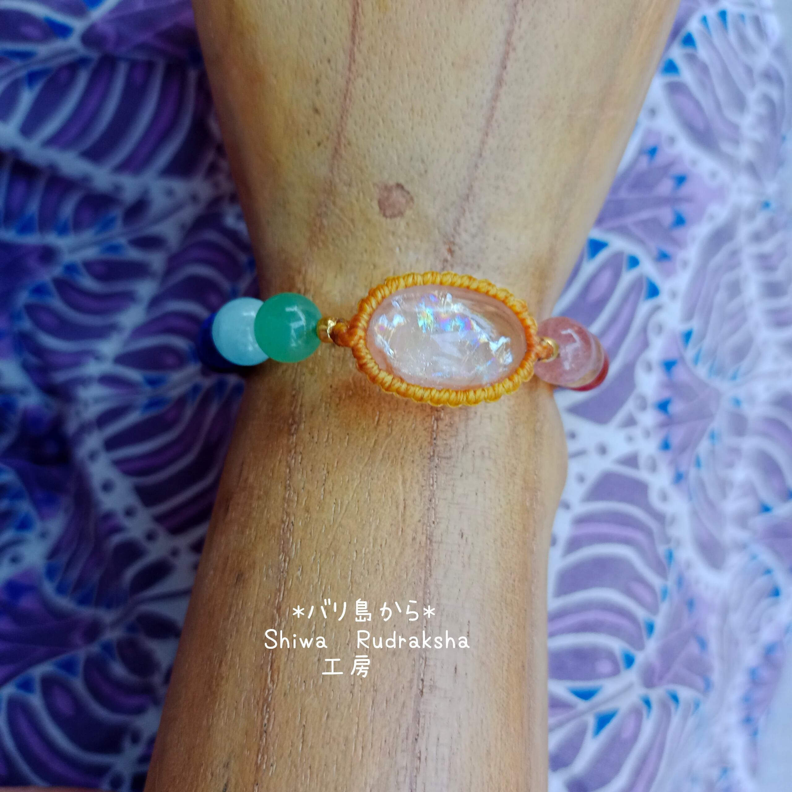 「インドネシア産水晶(アイリス入り)」のストーンをマクラメ加工した、8色のチャクラカラーと7面ルドラクシャ(ラクシュミー女神)を組み入れた調整可能な紐ブレスレットです。