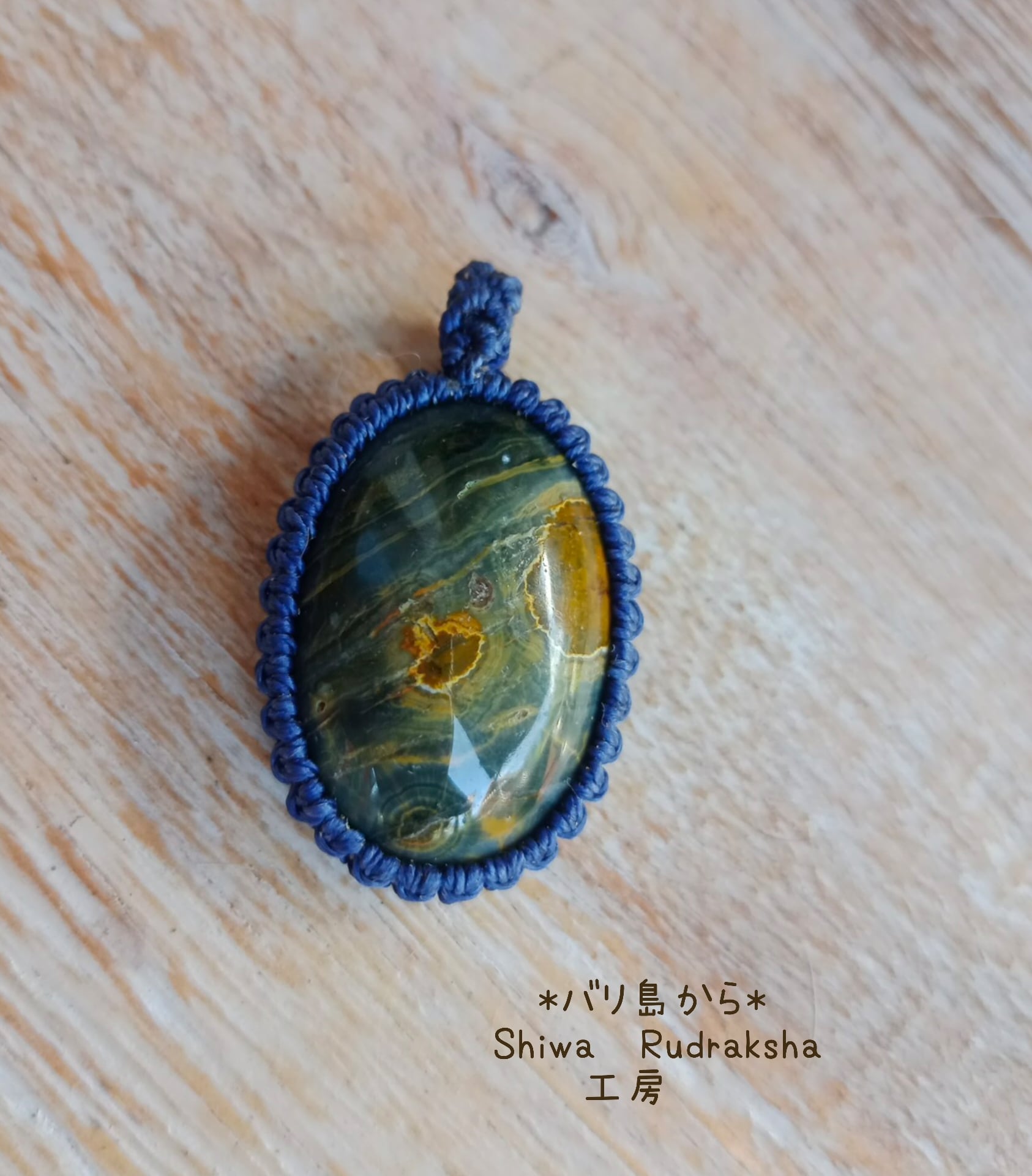 インドネシア、バリ島からお届けします♪ 「オーシャンジャスパー」の原石から研磨して製作した、マクラメ加工のペンダントトップです。 シックな模様の「オーシャンジャスパー」です。 特価にしています。 ★オーシャンジャスパー:約33mm×約22mm×約10mm ★マクラメの色:コバルトブルー