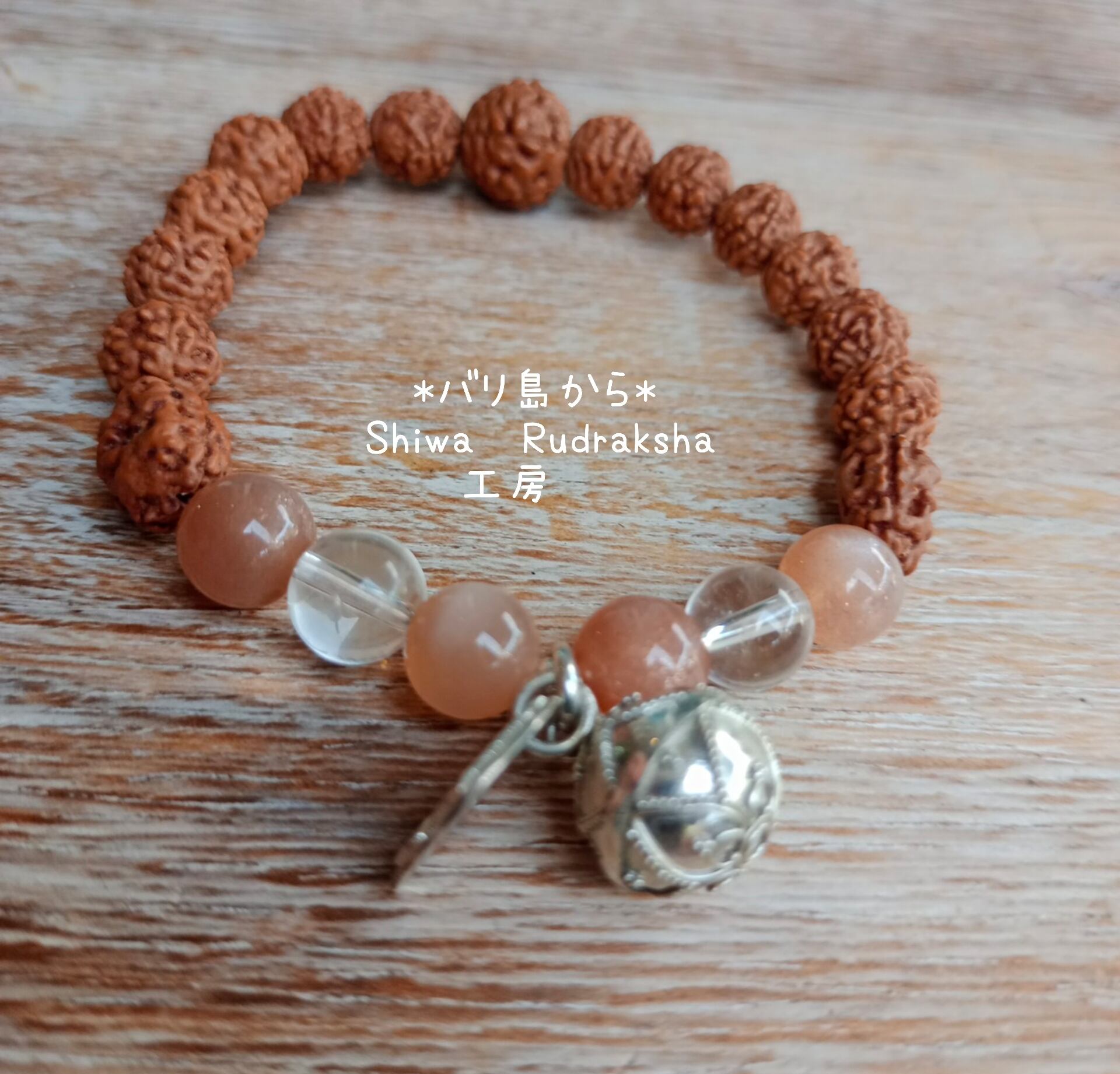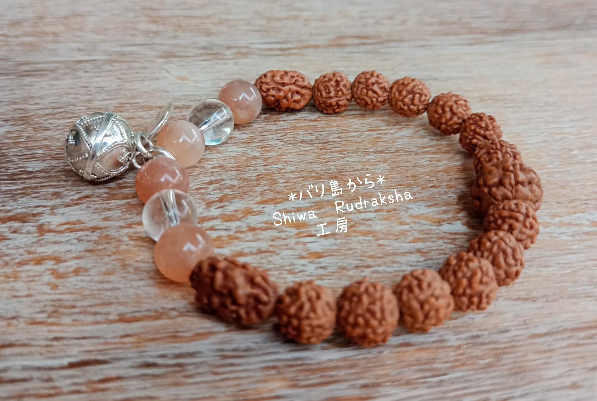 ★ルドラクシャ5面(約8mm)・ルドラクシャ7面(約12mm)・クリスタル水晶(約8mm)・オレンジムーンストーン(約8mm)・ガムランボール(約12mmシルバー)
