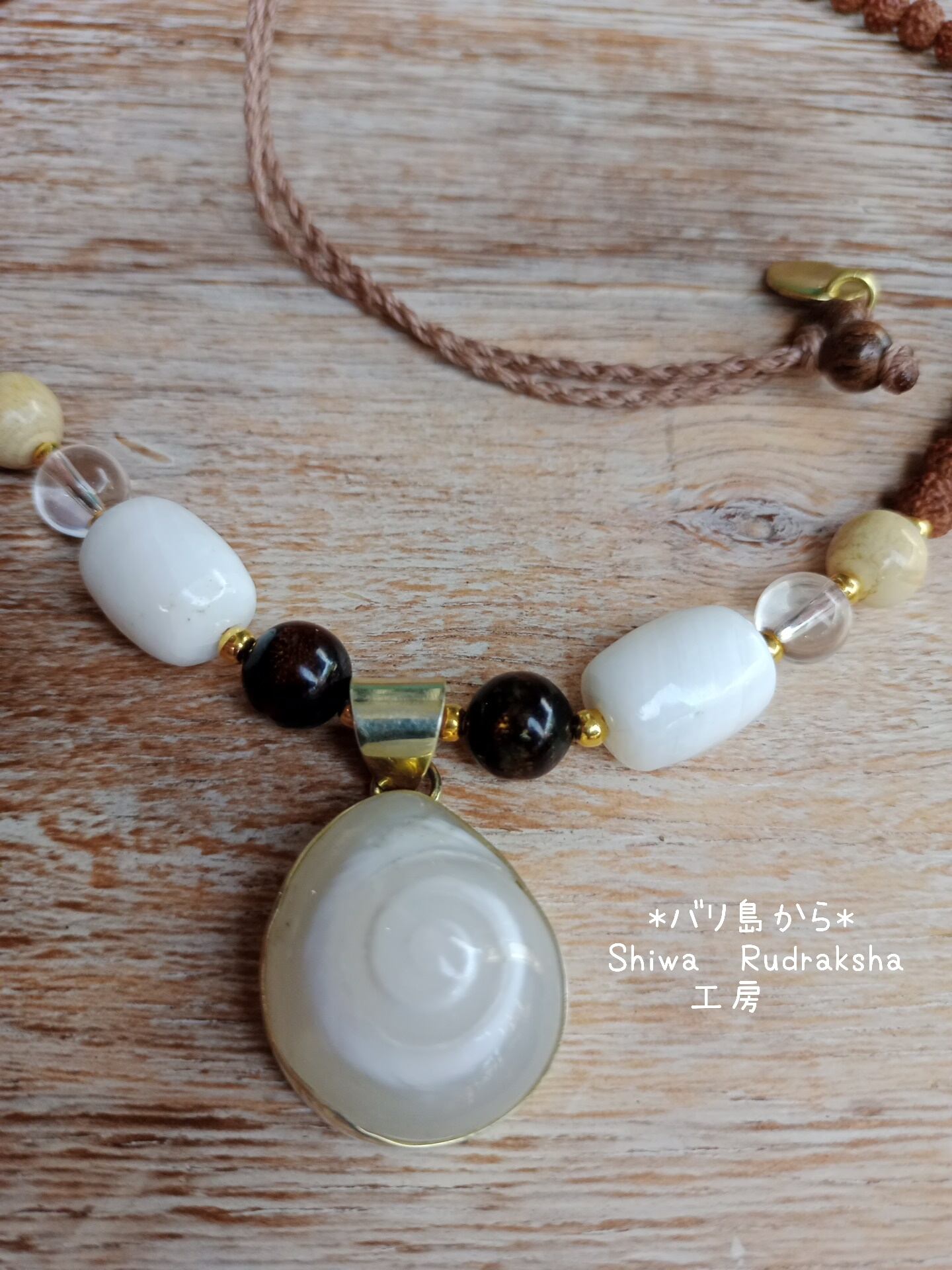ネックレス部分には、インド洋の自然の産物である珊瑚「ホワイトウリ」&ゴールドウリ」と、「ケオンコクーン」のロンデルを使用しています。
