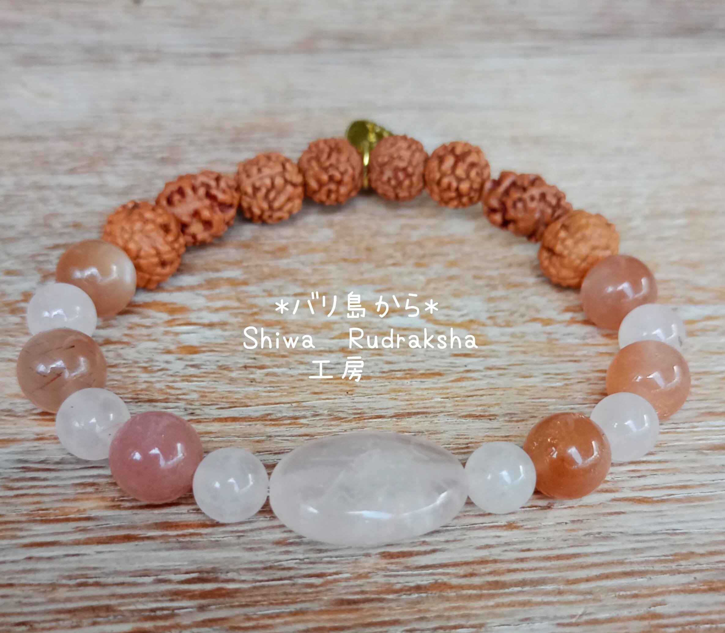 扁平型の「ローズクウォーツ」を真ん中にして、「オレンジムーンストーン」と「ローズクウォーツ」のビーズと、ルドラクシャ2面&7面を組み入れたブレスレットです。