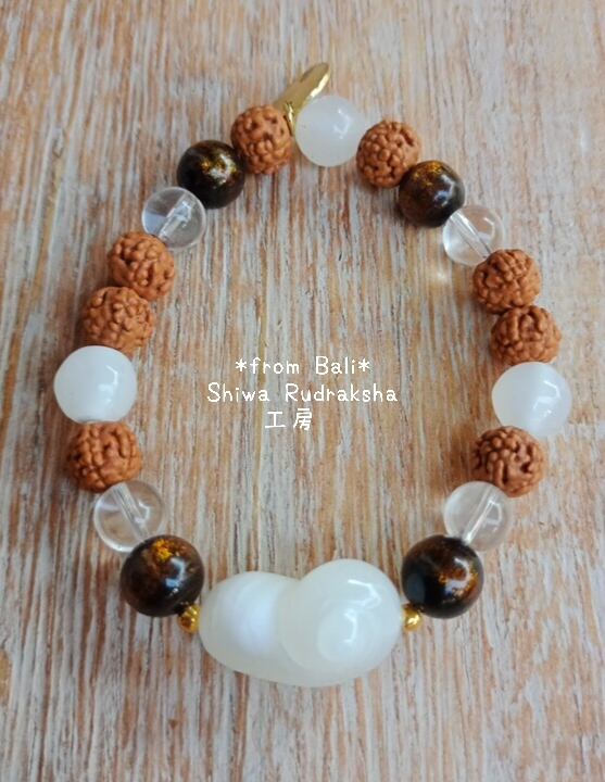★ルドラクシャ5面(約8mm)・ケオン茎ビーズ(約10mm)・クリスタル水晶(約8mm)・ゴールドウリ(約8mm)・ケオン天珠(約22mm×約16mm)